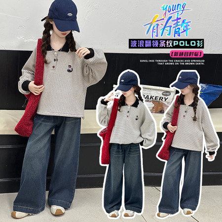 1*9收藏“2527波浪条纹POLO领卫衣牛仔裤套装”