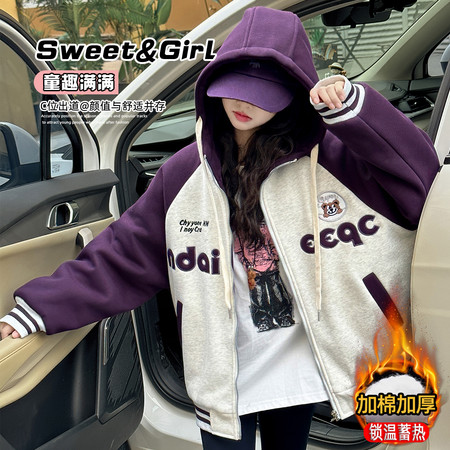 坏*仔下载视频“2530加棉加厚刺绣字母擦肩拼色连帽外套”